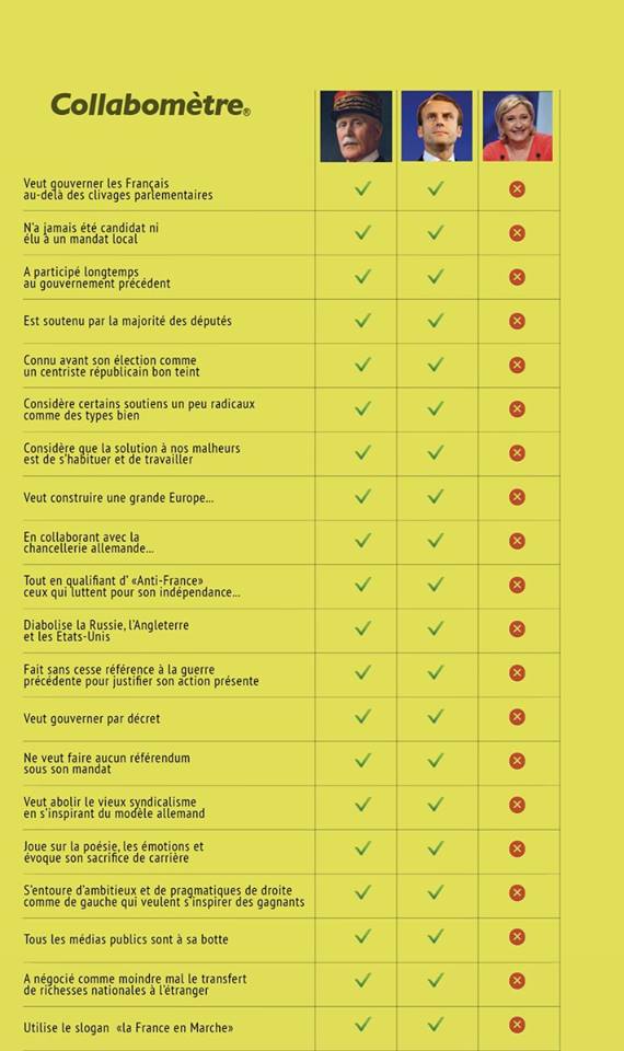 Je trouve que Marine le Pen a trouvé la bonne réponse face à la diffamatoire et infamante accusation d’extrémisme d’Emmanuel Macron mais qu’elle se laisse malgré tout trop enfermer dans cette qualification répétée ad nauseam sans réagir assez vite ni suffisamment. La réponse immédiate de collaborationnisme à toute accusation d’extrémisme est la bonne. Elle renvoie à une réalité passée honteuse dans notre histoire mais elle renvoie aussi à une réalité présente qu’il est immédiatement possible de mettre en parallèle. Elle désamorce consécutivement l’accusation d’extrémisme – qui sous-tend implicitement dans ce cas la qualification de fasciste – car comment quelqu’un qui s’oppose à la collaboration pourrait être un fasciste puisque, historiquement, c’est la collaboration avec le nazisme allemand qui était un fascisme et un extrémisme. Cette réponse me semble moins caricaturale que l’expression « Quatrième Reich » utilisée par Marie-France Garaud par exemple, permettant d’éviter l’insulte à pays étranger en se concentrant sur un problème de notre ressort et de cette attitude bien française.