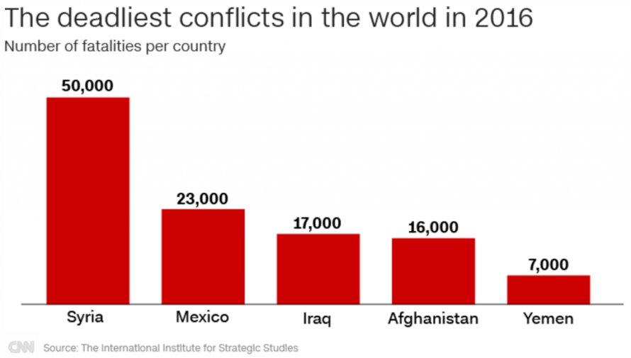 Il n’y a guère que la guerre civile syrienne qui a fait plus de morts (50 000). Le Mexique se classe maintenant devant des pays comme l’Irak (17 000 morts), l’Afghanistan (16 000) et le Yémen (7 000) dans le classement des pays les plus meurtriers. (CNN)
