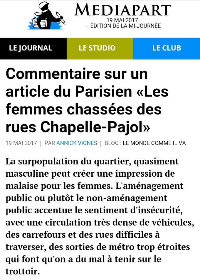 Dans le nord de Paris, dans le quartier de la Chapelle, la rue Pajol est une longue artère située entre les faisceaux ferroviaires des gares de l’Est et du Nord. On trouve à proximité France Terre d’Asile et l’Institut des Cultures d’Islam. Le quartier est marqué par un fort taux de populations d’origine immigrée. D’une immigration qui ne tolère pas la présence de femmes sur la voie publique. Dans ce temple de la boboïtude et du « vivre-ensemble » qu’est Paris, et sous la figure tutélaire de « sa » multiculturaliste mairesse Anne Hidalgo, voilà qui fait tache au point que Le Parisien, pourtant réputé pour sa prudence de sioux laïque en ces matières, vient de s’en faire l’écho. Le quotidien régional francilien, bien entendu, ne cite pas une seule fois le nom d’une quelconque doctrine théocratique qui pourrait avoir l’air d’être à l’origine de cet ostracisme. Non, seuls y sont désignés du doigt « les hommes », « des dizaines d’hommes seuls, vendeurs à la sauvette, dealeurs, migrants et passeurs », qui « tiennent les rues, harcelant les femmes ». Seul est osé, une fois, le terme journalistiquement correctissime de « migrants ».