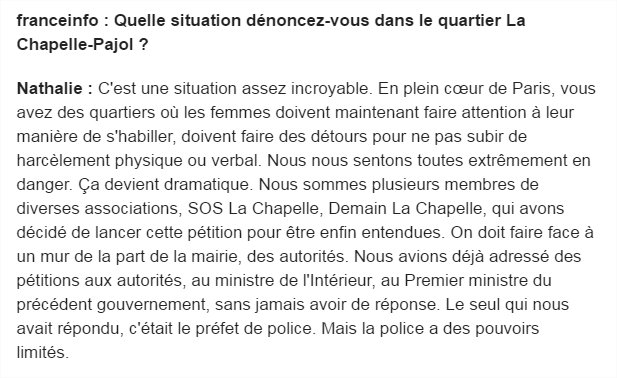Le Parisien rapporte le témoignage d’Aurélie, 38 ans, qui vit dans ce quartier Chapelle-Pajol depuis 15 ans : « Le simple fait de circuler est devenu problématique. Le café, en bas de chez moi, un bistrot autrefois sympa, s’est transformé en repaire exclusivement masculin et en permanence bondé : j’ai droit à mon lot de remarques lorsque je passe devant, d’autant plus qu’ils boivent énormément : il y a quelques jours, le simple fait de me mettre à ma fenêtre a déclenché un flot d’injures ». Laure, elle, a été menacée « avec des couteaux » par des vendeurs à la sauvette qui se bagarraient. La terreur a franchi le périphérique vers l’intérieur de la citadelle parisienne.