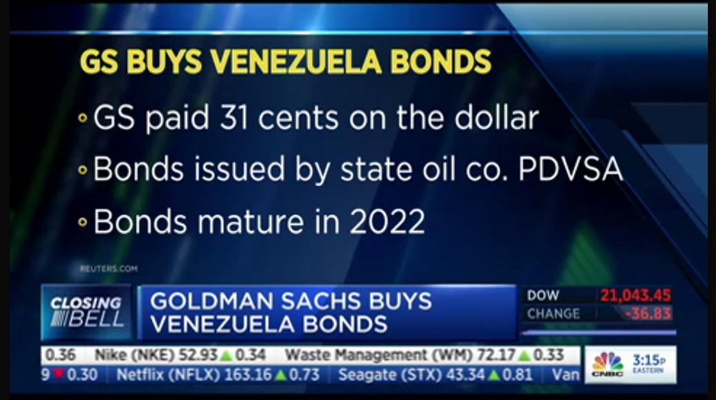 D’après les sources proches de l’opération de Goldman Sachs, la banque américaine n’est pas motivée politiquement : elle a simplement flairé la bonne affaire à un moment ou le gouvernement de Nicolas Maduro est contraint de brader les avoirs du pays. Depuis la crise des subprimes en 2008-09, tout le monde sait que la banque Goldman Sachs ne s’embarrasse pas de scrupules pour gagner de l’argent sur le dos des gens.