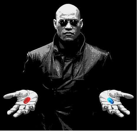 Neo n’a qu’une alternative. La pilule bleue renvoie Neo dans l’ignorance, l’amenant jusqu’à oublier qu’il a pris ladite pilule – il n’est d’ailleurs pas impossible qu’il se retrouve à nouveau confronté à ce choix en croyant que c’est la première fois. La pilule rouge amène Neo à poursuivre sa quête et à se réveiller, sachant qu’il s’agit d’un voyage sans retour et potentiellement douloureux vers la connaissance et la fin de l’illusion.