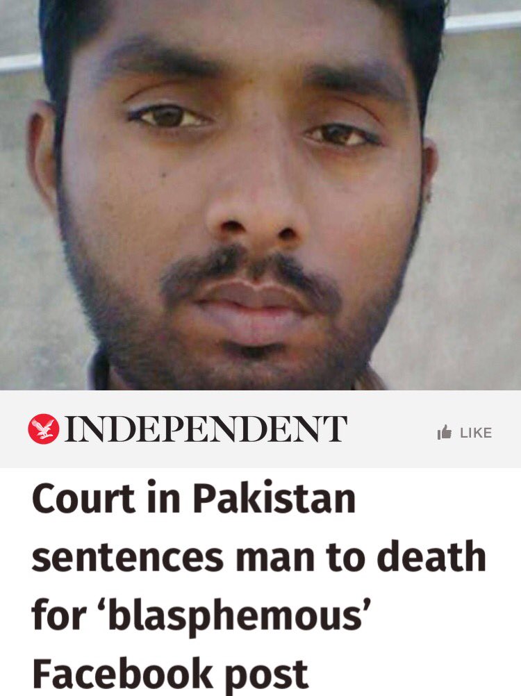 Il a été condamné conformément aux articles 298A et 295C du code pénal pakistanais dont l’ensemble est connu comme « la Loi sur le blasphème ». C’est la première condamnation de ce type faisant suite à des accusations en provenance du réseau social. Et la plus dure jamais imposée pour une infraction liée à la cybercriminalité. Le Pakistan n’a encore jamais exécuté quelqu’un reconnu coupable de blasphème ; ils croupissent en règle générale dans les prisons, à l’image d’Asia Bibi depuis 2009. Le dernier en date, Zafar Bhatti, chrétien faussement accusé de blasphème vient d’être condamné, il y a un mois, à la réclusion à perpétuité.