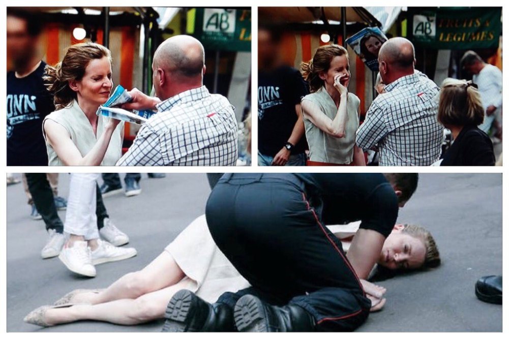 Les photos montraient d’une part un chauve en chemise à carreau de dos prenant les tracts de NKM et celle-ci levant la main, de l’autre NKM à terre, en plan large et en plan plus resserré avec un homme jeune en train de l’examiner.
