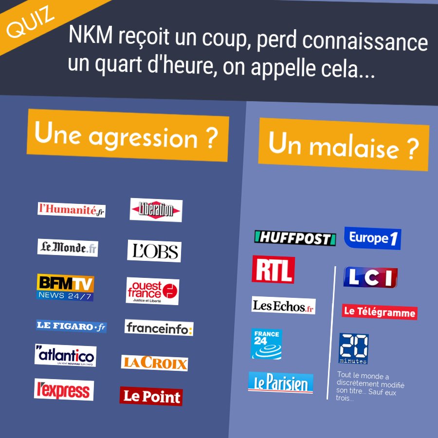 Maintenant, que s’est-il vraiment passé hier matin ? NKM a été prise à partie par un chauve vêtu d’une chemise à carreau qui était en colère et l’a traitée de bobo de merde. Un peu plus tard elle était à terre. Un témoin (Alexis) parle d’un « coup à la poitrine ». Aucun des autres témoignages ne le confirme. Aucune vue ne l’établit. Plusieurs personnes affirment que NKM a « perdu l’équilibre ». Nul n’explique pourquoi. Selon un témoin direct interrogé par le Parisien c’est en se protégeant (du paquet de tracts) que NKM s’est donnée un coup et est tombée au sol. Les Inrockuptibles affirment que « cette action conjuguée à la météo chaude et lourde a provoqué une perte momentanée de connaissance ». Si NKM n’a pas simulé (comme au foot), elle se serait giflée par maladresse, et, peut-être effrayée, aurait tourné de l’œil sous l’effet de la canicule, étant affaiblie par les régimes amaigrissants qu’elle suit, pense Français de souche, ou par le stress et le surmenage de la campagne. Ce qui expliquerait les « examens approfondis » qu’elle a suivis.