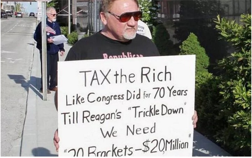 On voit ci-dessous ce militant dans une manifestation pour «taxer les riches» dont il avait la haine parce que la gauche répète inlassablement que les riches sont responsables des malheurs des pauvres :