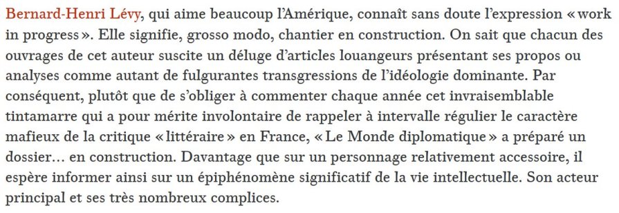 Or voici que le Monde Diplomatique annonce une braderie encore plus intéressante: la mise à disposition, en accès libre, de toute son archive BHL! Mieux qu’une année d’entartages, le geste du Diplo permettra aux chercheurs et aux curieux de cartographier l’ensemble de l’imposture BHL dans le temps et dans l’espace.