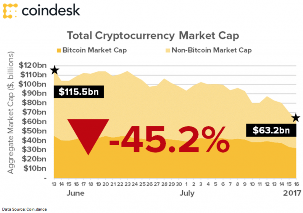 Le Graphique du Jour : Les crypto-monnaies sont dans la tourmente. Au cours du mois dernier, leur valeur totale a chuté de 45,2%.