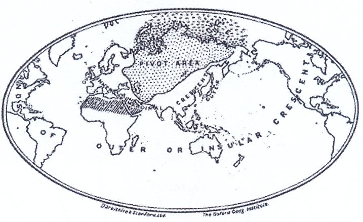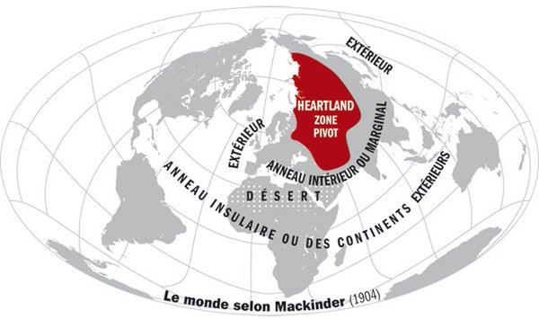 Les Américains restent façonnés par l’un des premiers géopoliticiens anglo-saxons, à savoir Halford John Mackinder. Pour Mackinder, afin de dominer le monde, il faut dominer l’île mondiale et principalement le cœur de cette île, le heartland, véritable « pivot géographique de l’histoire ».