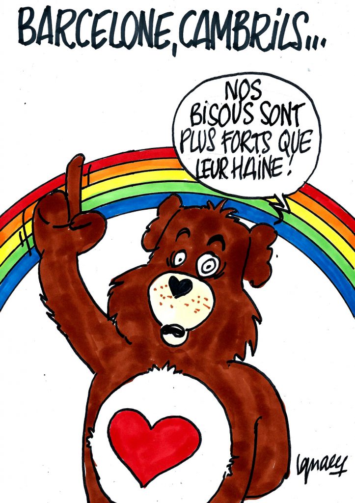 Las, les bisounours n’en tirent pas la conclusion qu’il faut arrêter l’invasion, au contraire. On lit sur les murs de l’Espagne « Tourists go home, refugees wellcome ». La mère des deux principaux suspects de Barcelone peut affirmer satisfaite, tous voiles dehors, que ses « garçons étaient tout à fait normaux », charmants, bons musulmans. Bon citoyens de l’Europe de demain. Les bougies s’allument sur les Ramblas. La tour Eiffel clignote. Ils n’auront pas notre haine. Pendant les attentats l’accueil continue.