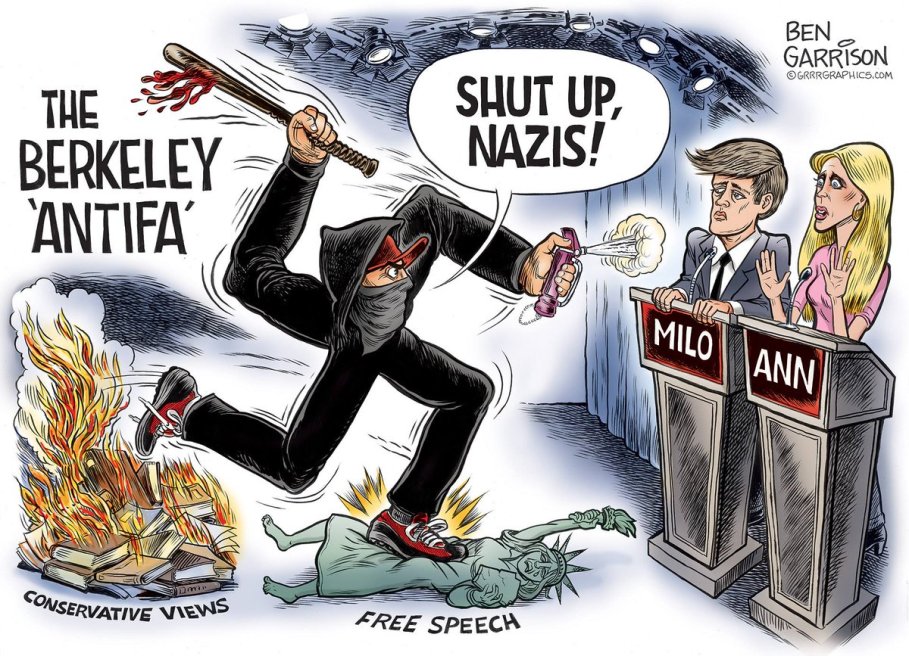 « Par exemple hier, sur MSNBC avec Chuck Todd, l’auteur d’un livre sur les Antifa a été autorisé à justifier la lutte contre les racistes (KKK et suprémacistes blancs) dans les rues. On lui a accordé la même importance qu’on accorderait dans une émission au chef du parti Démocrate ou du parti Républicain. Il a pu exprimer son point de vue, intégralement, et Chuck Todd lui a même laissé le dernier mot. Ces médias sont alliés à leurs extrémistes les plus fous. »