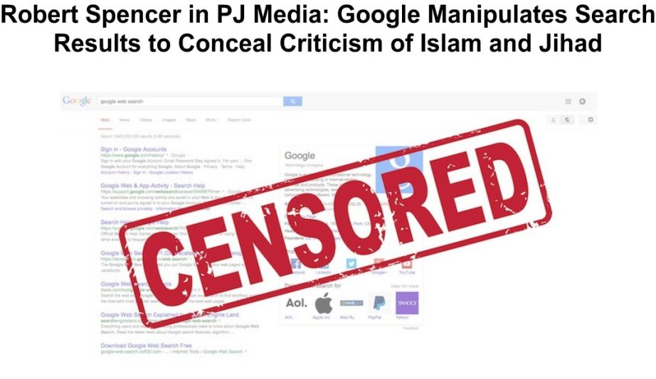 La société Google semble donc avoir mis en œuvre ce que lui demandait depuis le Texas, dans un texte pour le Huffington Post publié le 24 juin, l’imam Omar Suleiman : ne plus afficher dans les résultats les sites présentant l’islam sous un jour négatif. Les gérants de Google ont ainsi très rapidement accentué leur censure, alors qu’à l’automne dernier on pouvait déjà voir qu’ils favorisaient des sites moins pertinents et beaucoup moins populaires que Jihad Watch, quand ce dernier site apparaissait néanmoins encore en quatrième position pour les recherches sur le mot « jihad ». La manipulation avait été analysée en détail sur le site Jihad Watch.