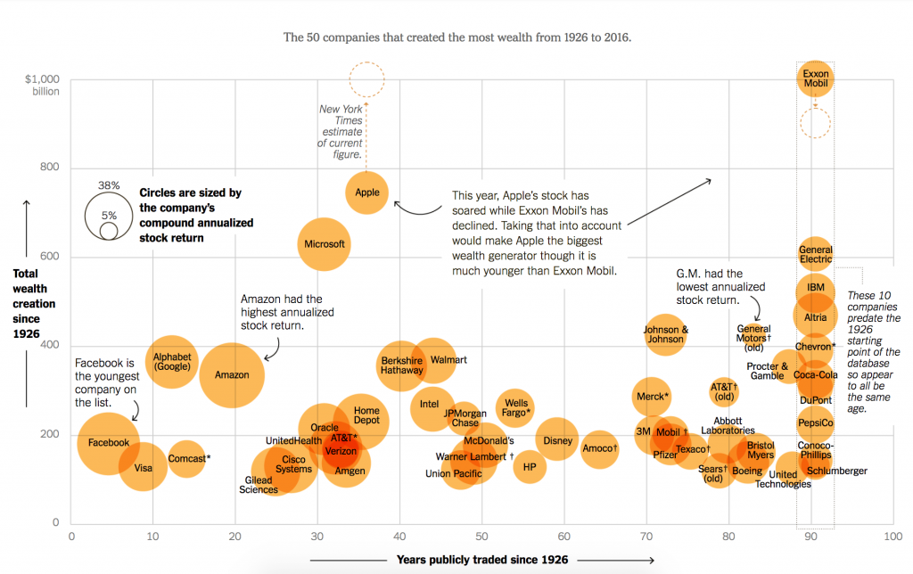 Le graphique du jour : le New York Times a publié un graphique remarquable qui regroupe les 50 entreprises qui ont créé le plus de valeur pour les investisseurs. Le gagnant est Exxon Mobil, mais cette société existe depuis bien plus longtemps qu’Apple et Microsoft. 30 actions de sociétés ont été à l’origine de 30 % de toute la valeur créée par action au cours des 90 dernières années (cliquez sur le graphique pour en voir une plus grande version).