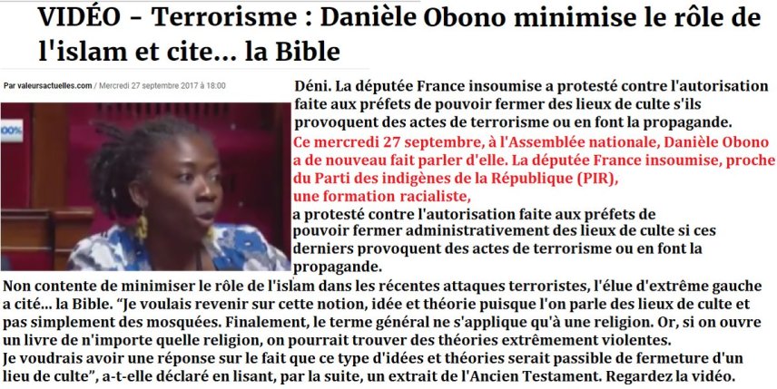 Mais voici la cerise : Obono a donc pris le temps d’éplucher l’Ancien Testament, oh, ah, et y a découvert qu’il y avait de la violence aussi, sans blague. Les petits notes c’est pour ça. Notons tout d’abord que le principe de laïcité écarte normalement toute exégèse de textes religieux à l’Assemblée Nationale …Une députée doit normalement savoir cela. Elle nous gratifie donc de quelques extraits, dont elle est la seule à penser qu’ils constituent un scoop. Et conclut brillamment qu’avec une telle loi des églises peuvent être fermées aussi si des prêtres y tiennent de tels propos, et que « donc », attention, c’est la preuve que la loi à venir est attentatoire aux libertés fondamentales et là comme il s’agit de VOS églises vous allez moins rigoler. L’idée générale derrière le sourire narquois. Et là j’ai envie de dire…. Elle sort d’OU la meuf ?????!!!!!! Elle a compris le problème ou pas ? Elle a compris qu’on s’en balance de ce qu’il y a dans de vieux bouquins pouilleux, que tout le monde, sauf elle, sait que l’Ancien Testament ça rigole pas tous les jours, que tout le monde, sauf elle – et là c’est une anti-cléricale farouche qui parle-, sait que les prêches catholiques sont basés essentiellement sur les évangiles et qu’à part peut-être Mgr Lefebvre plus personne ne fait raisonner les trompettes de Jericho depuis longtemps ? Elle a été chercher sur wiki « sécularisation », « Réforme », « Vatican 2 » etc, bref elle a une notion vague de l’aggiornamento qui a été fait et qui manque précisément à l’islam ? Elle sait que les prières des synagogues commencent toujours par une bénédiction pour la République Française qui la première leur a donné le titre de citoyen à part entière ? Elle a compris que si les terroristes s’appelaient David, Samuel ou Christian, venaient de Saint-Trifouillis ou de Tel-Aviv, on serait sur les dents en train d’éplucher là, oui, la Torah et l’Epitre aux Corinthiens pour essayer de comprendre où ça coince ? Elle sait que le terrorisme islamiste tue partout dans le monde, selon la même idéologie mortifère et dans des pays qui ne sont ni très « post-coloniaux », ni indécemment laïques ? Elle sait que, même des musulmans laïques, dénoncent les intégristes qui répandent une lecture fondamentaliste des textes sacrés islamiques ? Elle sait que, si par extraordinaire il arrivait que l’on tombe sur un « Lefebvre »exalté appelant au meurtre des sarrasins et des israélites, ça ne nous ferait ni chaud ni froid que l’on ferme son lieu d’exercice et même on trouverait ça bien, quand bien même il n’y aurait pas -encore- mort d’homme ? Au moment où j’hésitais entre le rire et les larmes, le président de séance a eu pitié et a mis fin à l’intervention. Que l’on devienne députée sans connaissance du pays et avec des lacunes culturelles graves, passe encore, elle n’est pas la seule et encore moins depuis juin 2017, je dis ça, je dis rien. Mais que l’on prenne la parole à l’Assemblée Nationale sur un sujet qu’on ne maîtrise pas, dans une approche aussi idéologique qu’inculte et plus proche du niveau d’un exposé de 6ème par contre…. Mais bon, je dois être raciste en fait.