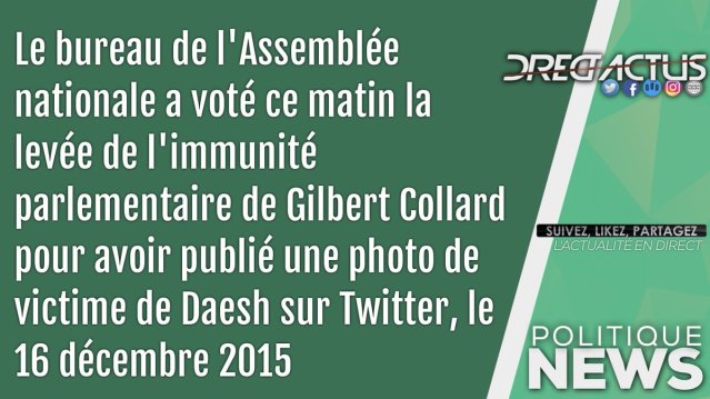 La raison véritable, on le sait tous ici, c’est « pas d’amalgame » ! Pour ce qui concerne Gilbert Collard, comme Marine Le Pen et d’autres poursuivis en justice, la raison invoquée est « apologie du terrorisme ». Reconnaissons que, là, nous sommes dans l’accusation sordide ! D’abord, parce que s’il y a bien des personnalités politiques qui ont dans leur collimateur Daech et ses fous d’Allah, ce sont bien ces députés ! Ensuite, dire que montrer les ignominies causées par ces islamistes sanguinaires inciterait d’autres à faire de même…