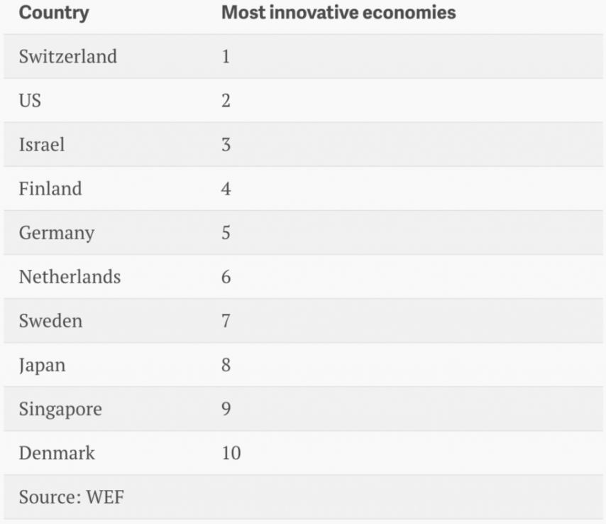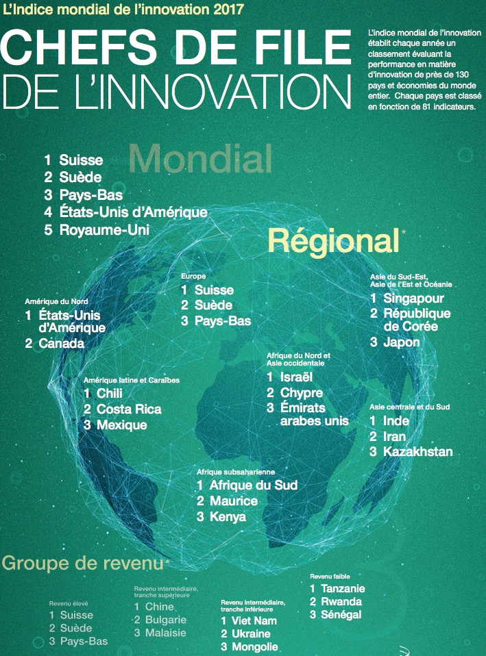 Indice mondial 2017 de l’innovation publiée conjointement par l’Université Cornell et l’INSEAD et l’Organisation Mondiale de la Propriété Intellectuelle (OMPI).