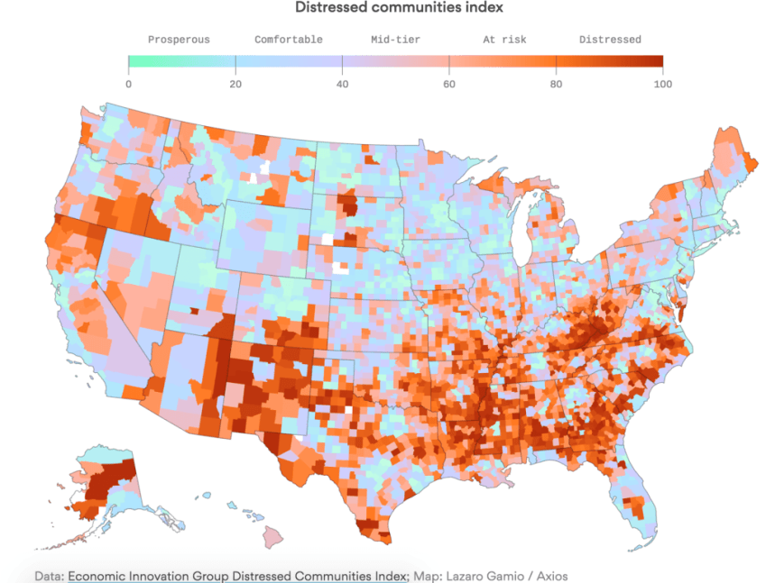 Aux États-Unis, seule une partie de la population a pu bénéficier de la reprise économique. Les régions qui ont été les plus durement touchées par la récession se trouvent aussi être celles qui ont été en grande partie exclues par cette reprise. C’est ce qui ressort d’un rapport de l’Economic Innovation Group, un think tank de Washington.