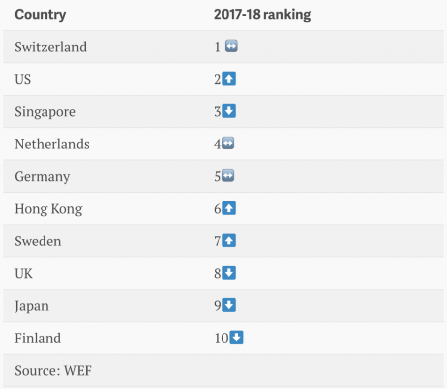 Cela fait 6 années consécutives que la Suisse domine le classement des économies les plus compétitives. De plus, le pays enregistre également un excellent score en ce qui concerne l’efficacité du marché du travail. Ces dernières années, Singapour était le plus grand challenger de la Suisse, mais la ville-Etat d’Asie est maintenant retombée à la 3e place. Singapour a dû laisser sa place aux États-Unis, qui pendant pendant 3 ans, ont été relégués à la 3e place.