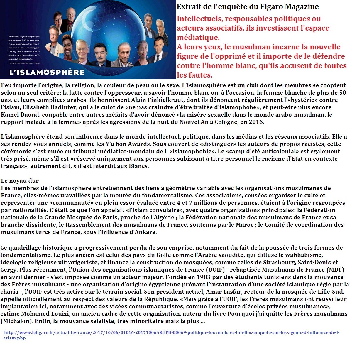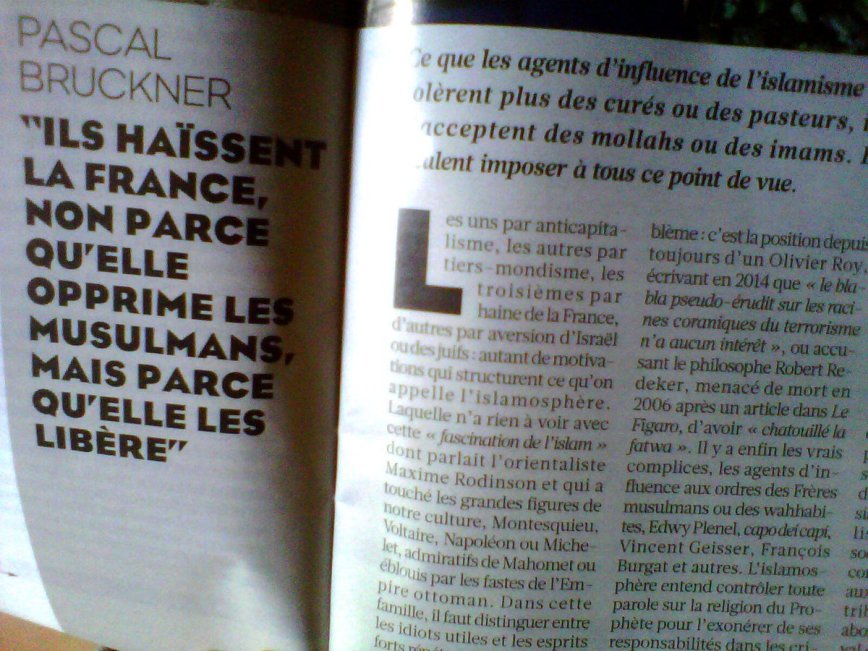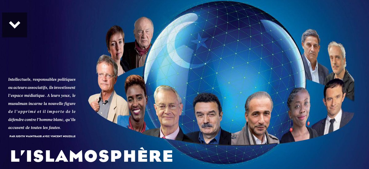 Le Figaro Magazine de ce week-end a réuni cette charmante coterie sous l’oriflamme, sans doute moins connotée, « d’islamosphère », allant jusqu’à faire sienne l’expression – utilisée par Pascal Bruckner – d’« agents d’influence de l’islam » pour désigner intellectuels, politiques et associatifs qui se comportent en « vrais complices […] aux ordres des Frères musulmans ou des wahhabites, Edwy Plenel, capo dei capi ». Bruckner considère à bon droit que « l’islamosphère entend contrôler toute parole sur la religion du Prophète pour l’exonérer de ses responsabilités dans le crimes djihadistes et les imputer aux seules nations occidentales, coupables par essence ».