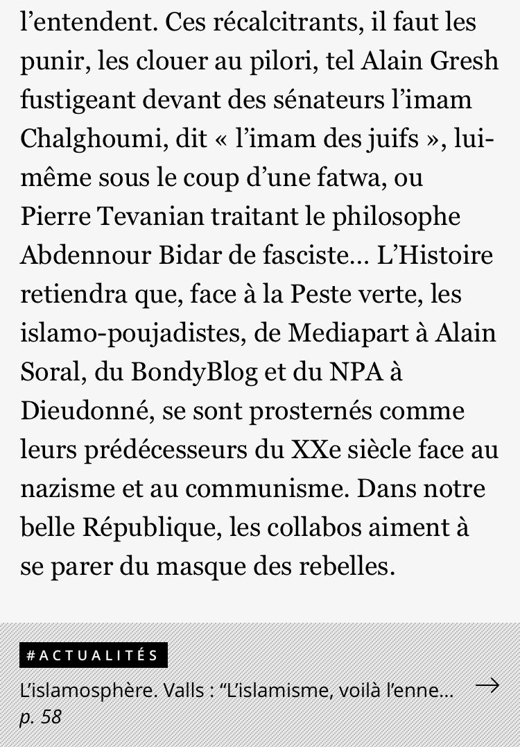 L’Histoire retiendra que, face à la Peste verte, les islamo-poujadistes, de Mediapart à Alain Soral, du Bondy Blog et du NPA à Dieudonné, se sont prosternés comme leurs prédécesseurs du XXe siècle face au nazisme et au communisme. Dans notre belle République, les collabos aiment à se parer du masque des rebelles.