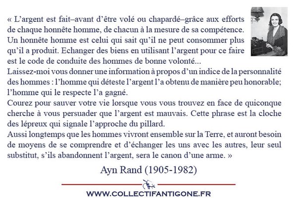 Lorsque vous observez que les échanges sont réalisés non par consentement mutuel, mais par obligation, Lorsque vous observez que pour produire vous devez obtenir l’autorisation d’hommes qui ne produisent rien, Lorsque vous observez que l’argent coule vers ceux qui échangent non des biens ou services, mais des faveurs et des privilèges, Lorsque vous observez que ces hommes s’enrichissent par l’appropriation des biens d’autrui plus que par le travail, Lorsque vous observez que vos lois ne vous protègent pas contre eux mais les protègent contre vous, Lorsque vous observez que la corruption est récompensée et que l’honnêté devient un sacrifice… Vous pouvez commencer à vous rendre compte que votre société est condamnée. Ayn Rand 1959 |