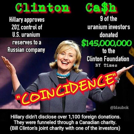 - La fondation Clinton a collecté jusqu’à 145 millions de dollars de dons, quelques mois avant le contrat de vente de l’uranium, et ces dons ont été par le plus grand hasard versés par 9 personnalités russes concernées par l’accord alors que Hillary Clinton a présidé le Comité des investissements étrangers les États-Unis et donné son accord à la vente de l’uranium.