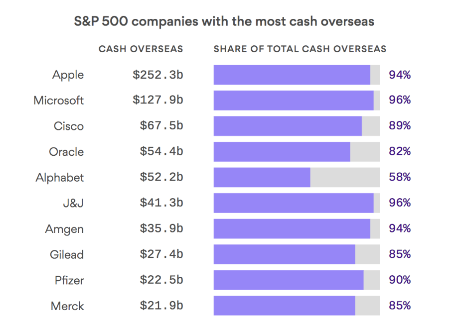 30 des plus grandes entreprises américaines ont placé près de 1000 milliards de dollars à l’étranger. Pour la plupart de ces firmes, cela représente 85 % ou plus de toutes leurs liquidités. Ci-dessous, le top 10. (Crédit Suisse)