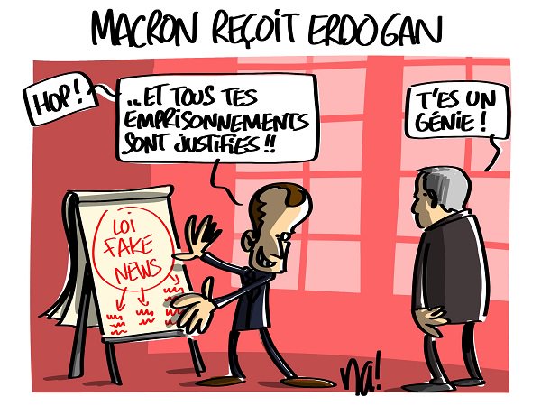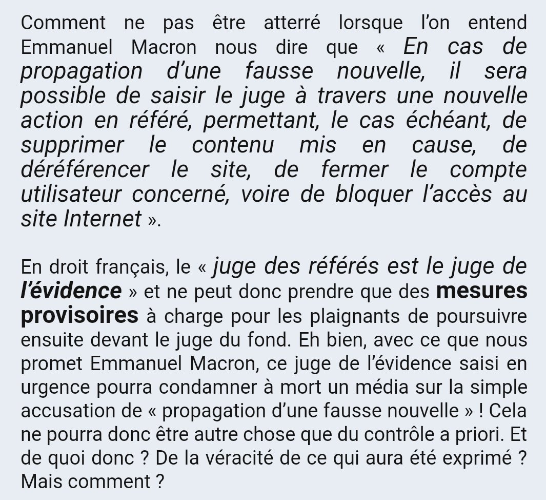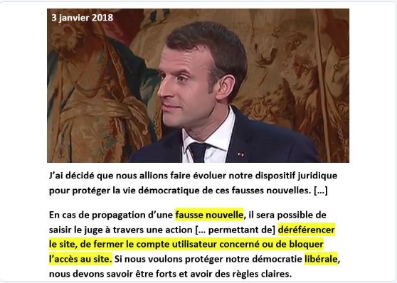 A l’image de Trump ou de Poutine, Macron le Mondialiste se rêve en Autocrate Souverainiste et pour cela il a compris que comme au bon vieux temps de la « Peyrefitte ORTF », tradition oblige, il lui fallait savoir se mettre en scène lui et sa petite famille sur le mode « point de vue, images du Monde » version monégasque…Une image et un point de vue contrôlés nécessitent par ricochet le contrôle de de l’image et de l’information et la volonté de puissance macronienne visant à judiciariser l’information rentre dans cette logique….Compte tenu d’un contrôle presque complet des médias officiels en France par l’Etat via la mécanique pernicieuse de la subvention, la mécanique propagandiste macronienne agit à plein et fait de Macron le fossoyeur de la souveraineté française le Héraut des temps modernes… Ne restait plus qu’à étouffer les derniers souffles critiques émanant de la sphère internet…Quelques nouvelles lois liberticides devraient y mettre bon ordre….Gloire donc à Macron 1er notre nouveau Président devant l’éternel et que Dieu bénisse Dame Brigitte toute auréolée de son infinie bonté….