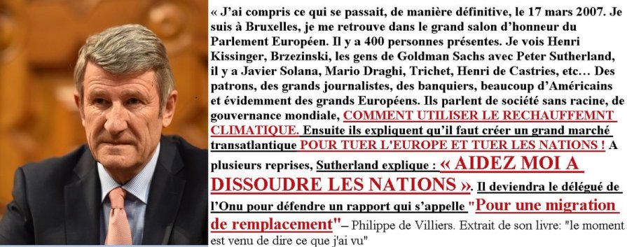 Dans un entretien au centre de presse de l’ONU, Sutherland livrait alors son message aux gouvernants : « Je demanderai aux gouvernements de coopérer, de reconnaître que la souveraineté est une illusion – que la souveraineté est une illusion absolue qui doit être abandonnée. Le temps où les pays se cachaient derrière des frontières et des clôtures est révolu. Nous devons travailler ensemble et coopérer ensemble pour faire advenir un monde meilleur. Et cela implique que nous mettions en cause certains vieux préjugés, que nous mettions en cause des souvenirs historiques et des images de notre propre pays, et que nous reconnaissions que nous faisons partie de l’humanité. » On lui attribue d’avoir dit un jour que l’opposition à la poursuite de la globalisation était « moralement indéfendable ». A l’heure où l’on peut violer tous les dix commandements ensemble et même espérer trouver quelque justification en haut lieu au nom des difficultés et des circonstances de la vie, c’est donc là que se niche le sens moral, l’idée qu’il existe un mal absolu et peut-être même impardonnable. Le mondialisme est bien une nouvelle religion !
