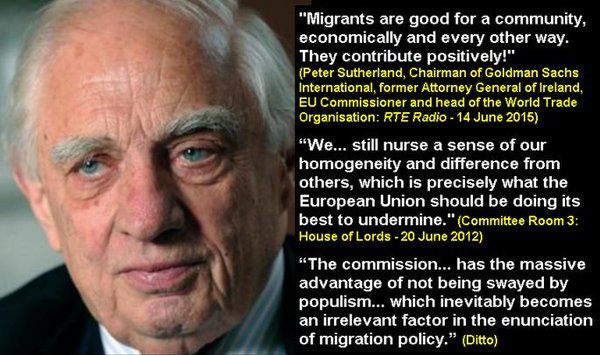 Champion de l’intégration européenne, Peter Sutherland a également œuvré pour le multiculturalisme et l’ouverture des frontières de l’UE à toute la misère du monde. En tant représentant spécial des Nations unies pour les migrations, le haut poste qu’il a occupé jusqu’en mars 2017, et membre de nombreux autres groupements internationaux pour les migrations, il n’a jamais caché son désir de voir les nations perdre leur sens de l’identité nationale. En 2012, il le dit très ouvertement : selon lui, l’Union européenne devait faire « tout ce qui était en son pouvoir pour saper » le sens de « l’homogénéité » nationale au Royaume-Uni et en Europe afin de permettre à l’avènement d’« Etats multiculturels », prêt à accueillir davantage d’étrangers comme le font les Etats-Unis, l’Australie ou la Nouvelle-Zélande qui sont des « sociétés de migration ». Il tirait argument de la dénatalité pour promouvoir l’Etat multiculturel, affirmant que l’UE devait favoriser la migration de masse « pour difficile que ce soit de l’expliquer aux citoyens ».