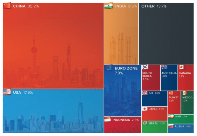 Le Graphique du Jour : Entre 2017 et 2019, l’économie mondiale a crû de 6 500 milliards de dollars supplémentaires, dont plus de la moitié proviennent de deux pays: la Chine et les États-Unis. (Chiffres du FMI et de la Banque mondiale)