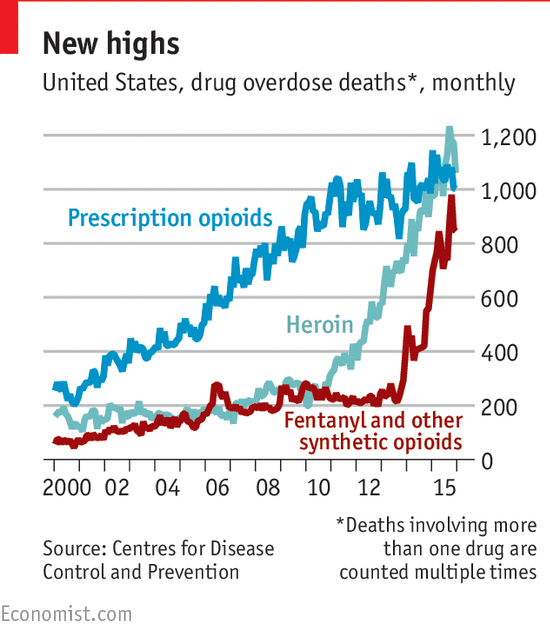 Les Américains ont mal, et la « solution » du cartel des soins de santé, les « opioïdes non addictifs » fait des ravages chez tous ceux qui ont fait confiance au système de soins pour se traiter par des analgésiques non addictifs. Si la victime nouvellement toxicomane ne peut plus obtenir l’opioïde synthétique prescrit, le choix se limite à la rue (héroïne). C’est pourquoi les décès liés à l’héroïne augmentent parallèlement à ceux causés par les opioïdes synthétiques.