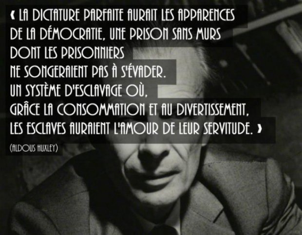 Sinon, quoi dire de plus sinon qu’Huxley faisait preuve dans ses écrits d’une prémonition assez impressionnante. Le seul bémol porte sur l’affirmation selon laquelle « Les faits contrôlables semblent indiquer assez nettement que dans la plupart des pays sous-développés, le sort de l’individu s’est détérioré de façon appréciable au cours du dernier demi-siècle. Les habitants sont plus mal nourris; il existe moins de biens de consommation disponibles par tête et pratiquement tous les efforts faits pour améliorer la situation ont été annulés par l’impitoyable pression d’un accroissement continu de la population. » alors qu’on constate une baisse notable de l’extrême pauvreté dans le monde (https://www.franceculture.fr/societe/lextreme-pauvrete-recule-dans-le-monde). Le reste est globalement juste et indique qu’un combat de titan est en cours pour s’approprier, au moins dans les sociétés occidentales et via les médias mainstream (TV, radios, presse) les cerveaux disponibles. Est-ce le fruit d’une action concertée ou est-ce la fait d’une conjonction d’intérêts politiques et économiques? Difficile de trancher mais, philosophiquement parlant, c’est bien l’idéal démocratique qui souffre donnant indirectement raison à Orwell: « La guerre, c’est la paix. La liberté, c’est l’esclavage. L’ignorance, c’est la force. ». Quant au naufrage du système éducatif français, il indique simplement l’avènement voulue d’un asservissement complet de la population par l’utilisation de technique empruntée à la Novlangue et d’un régime policier et totalitaire, d’une société de la surveillance, ainsi que de la réduction des libertés (l’état d’urgence est ainsi devenu la règle depuis l’année dernière. Même porté par la plus sincère des démarches, il autorise les dérives les plus extrêmes si un besoin s’en fait sentir). Quant au relativisme et au constructivisme institutionnel qu’il dispense sans vergogne, c’est le philosophe français Jean-Jacques Rosat qui en parle le mieux: « La leçon philosophique et politique de 1984, c’est que la liberté et la démocratie sont incompatibles avec le relativisme et le constructivisme généralisés ». Le désintérêt croissant pour les élections témoigne de cette évolution,certains réclamant des mesures coercitives pour que les citoyens s’acquittent de leur devoir alors que d’autres y voient le réflexe salutaire d’une population qui, en dépit des tonnes de propagandes auxquelles elle est soumis, refuse de jouer dans un jeu où les cartes sont de plus en plus biseautées.