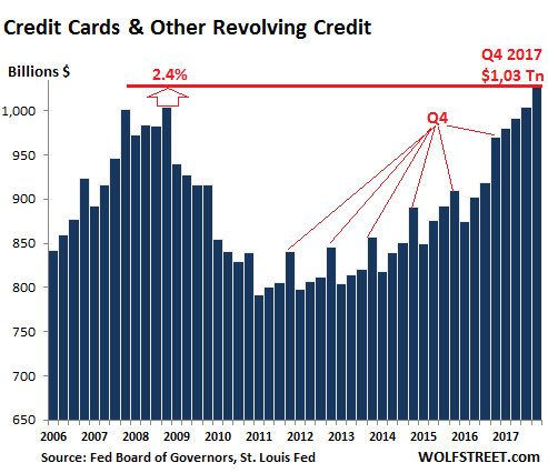 Les dettes de type carte de crédit et autres crédits renouvelables ont augmenté de 6 % sur base annuelle durant le dernier trimestre de l’année dernière pour atteindre 1,027 trillion. Cette progression est néanmoins inférieure au 9,2 % du T3, et aux presque 10 % du T2, sans parler de la hausse incroyable de 12 % du T1 2017. (…)
