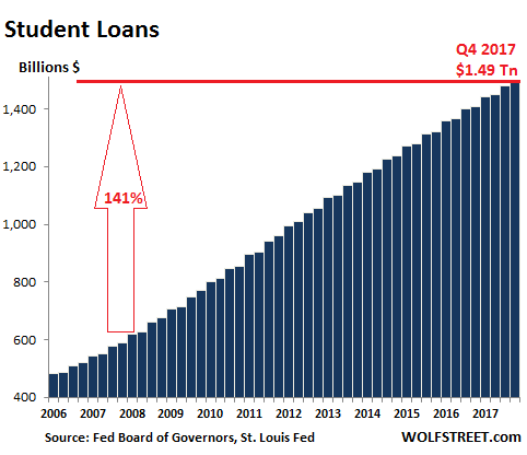 Le problème avec la dette est qu’elle ne disparaît pas par magie. Lorsque le débiteur ne parvient pas à rembourser, il y a fatalement un créditeur qui doit encaisser une perte. Certains crédits auto et sommes empruntées par carte de crédit restent sur le bilan des prêteurs, tandis que d’autres ont été titrisés et vendus à des investisseurs. En revanche, les prêts étudiants sont presque tous garantis par les contribuables, ou directement financés par le gouvernement. (…) »