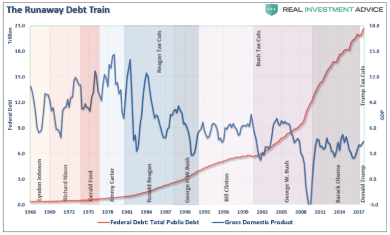 Même si de nombreux Américains restent attentifs à ce dossier, le problème a été rapidement balayé du revers de la main par la majorité des médias dominants, ainsi que les membres du Congrès désireux de se faire réélire, en suggérant que la réforme fiscale permettra de doper significativement la croissance dans la décennie à venir. L’opinion qui prévaut est la suivante :