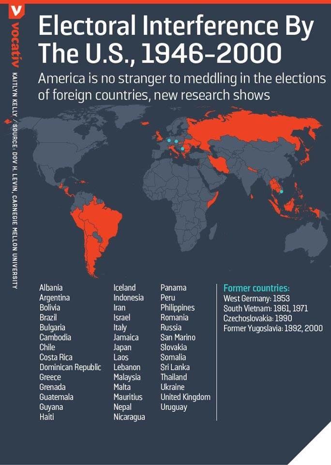 Shane cite une étude de Dov H Levin de Carnegie Mellon cherchant à quantifier les « opérations d’influence électorale » des Etats-Unis et de l’Union soviétique / la Russie entre 1946 et 2000. Il en compte 81 de la part des Etats-Unis et 36 de la part de l’Union soviétique / la Russie – tout en estimant que certaines opérations initiées depuis le territoire russe nous sont restées inconnues.