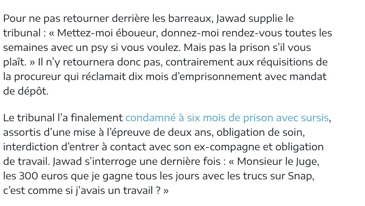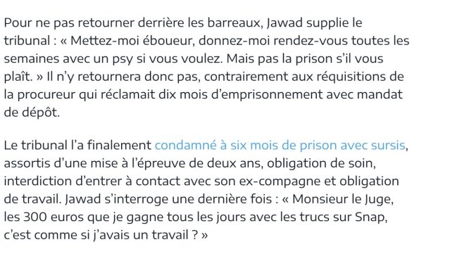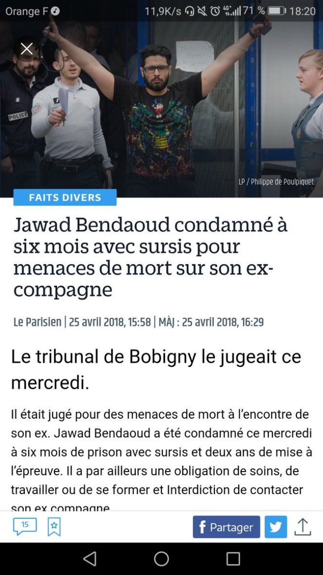 Roi ? Plus que ça : c’est une hydre de complaisance. Il a cent têtes, qui trépignent de ne pas être sur la photo. Jawad, par exemple, Jawad Bendaoud, acquitté par la justice mais logeur de terroristes à vie pour l’opinion. Ce statut lui est monté à la tête. Il a d’abord aimé la gloire en chochotte. Dans un reportage au bout du monde, sur la plage devant des hlm vides, il nous expliquait que, bon, il fallait prendre du recul, on le reconnaît partout, c’est gênant… Un temps de silence lui paraissait décent… Bref, entre le bouquet de violettes et la sagesse des grands-mères, un garçon parfait. Et puis paf, voilà-t-y pas qu’il comparaissait hier devant le tribunal de Bobigny pour des violences conjugales commises en 2015 et des menaces de mort actuelles contre son ex-compagne (« Je vais te découper »). Et il est apparu à l’audience tel qu’en lui-même enfin l’actualité le change. Il mène grand train depuis deux mois qu’il est sorti de prison. Il a « couché avec 17 filles », il a 80.000 vues sur Snapchat, il en tire pour 300 euros par jour de publicité, les boites de nuit le laissent consommer gratuitement pour six mille euros d’alcool. Verdict : six mois avec sursis. Jawad est sorti du tribunal les bras en V, triomphant. Narcisse riait de se voir si beau dans le miroir de la justice. Son avocat susurre : « Il a perdu une partie de son cerveau ».