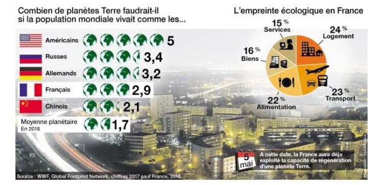 En 1961, toujours selon ces mêmes savants calculs, la France n’atteignait le jour du dépassement que le 20 septembre. Par notre indolence croissante nous mettons en danger la survie de la planète. Il va falloir entreprendre une « politique de désendettement écologique ». C’est un devoir de solidarité mondiale. Sans doute y-a-t-il pire que nous. Le jour du dépassement tombe le premier mai en Allemagne, en Russie le 20 avril, en Suède le 3 avril, au Canada le 17 mars, aux Etats-Unis le 14 mars et au Qatar le 9 février. Salauds de Qatari, déjà qu’ils ont acheté le PSG ! En tout cas, c’est clair : c’est le Nord le coupable ! Notre façon de vivre. Au Maroc le jour du dépassement tombe le 16 décembre, et au Vietnam, prix d’Excellence, le 20 décembre. Prenons exemple. S’ils consommaient comme nous, il faudrait, tenez-vous bien, c’est écrit noir sur blanc « 2,9 terres » pour s’en sortir.