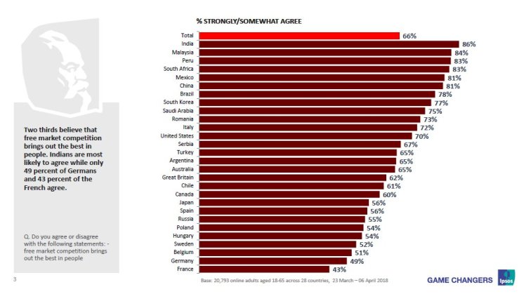sondage @IpsosFrance dans 28 pays sur la perception du socialisme, 200 ans après la naissance de #Marx. Pour 43% des Français, « la libre compétition permet de tirer le meilleur de chacun », de loin le plus bas niveau mesuré.