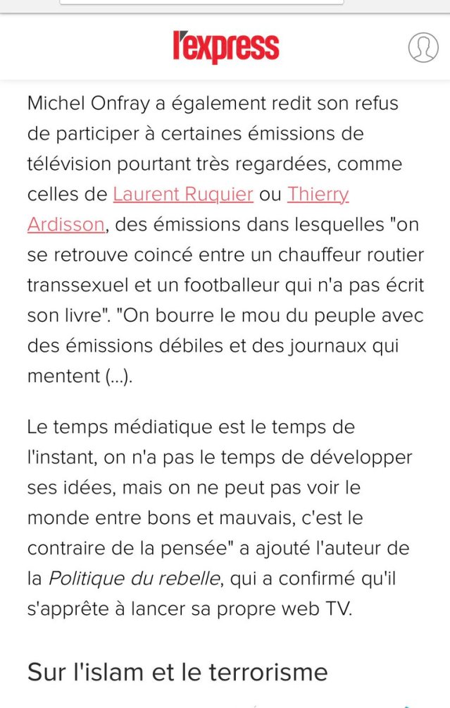 Onfray philosophe estampillé de gauche fait à la manière de Monsieur Jourdain du nihilisme sans le savoir ! Il terrorise les idées et tous ceux qui n’en ont pas…et là il est servi ! Comme sur un plateau… de TV !