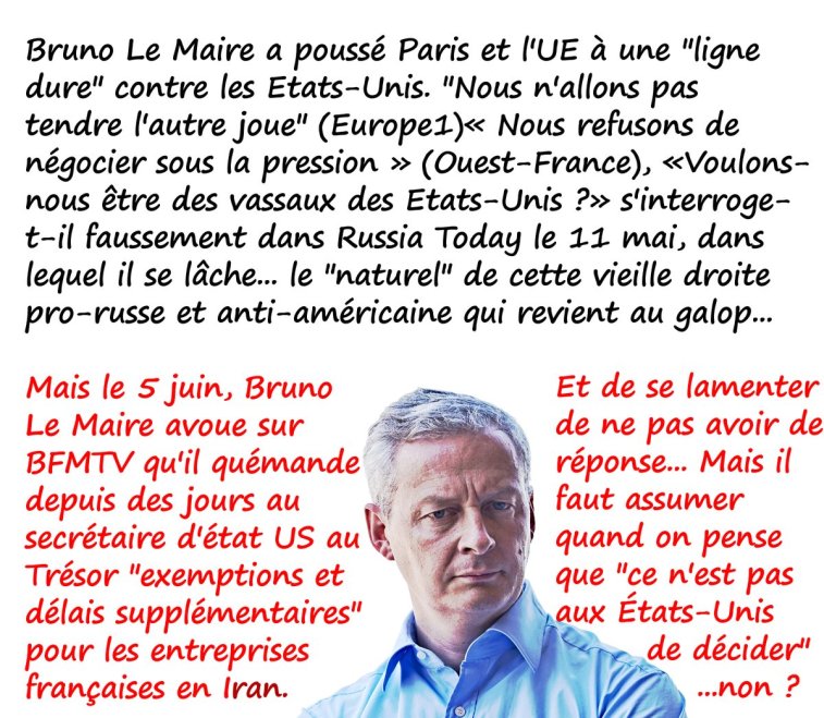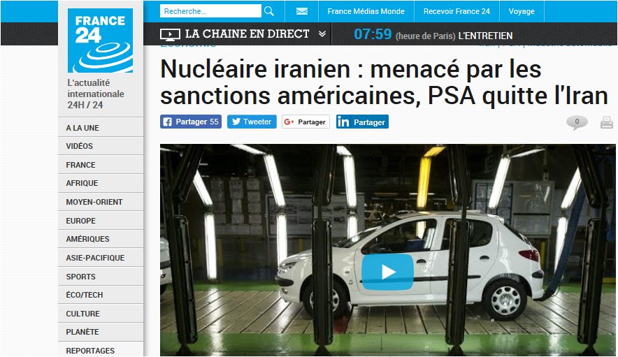 Le groupe PSA Peugeot-Citroën se retire d’Iran. Il n’avait pas d’autre choix depuis que Trump a imposé l’embargo. L’hégémonie américaine est aussi préjudiciable aux intérêts Français que la gouvernance mondiale.