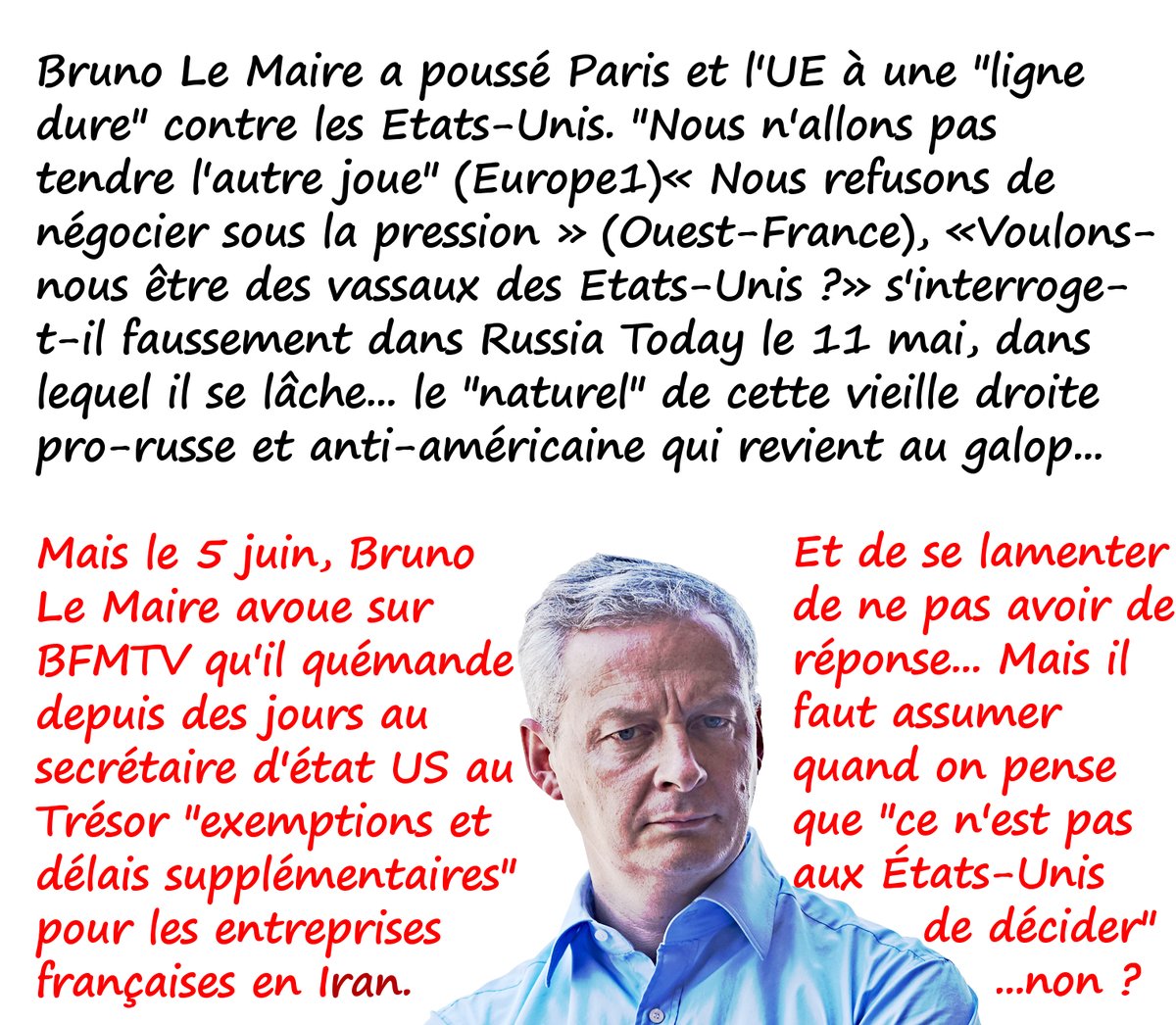 Il est clair que les Européens, et les autres, se défaussent sur Donald Trump de leur propre lâcheté. Avant que Trump ne soit là, les entreprises européennes acceptaient platement d’aller se faire taper sur les doigts par la justice américaine. Et aujourd’hui, elles se plient à toute vitesse à la volonté américaine. Peugeot n’est pas la seule dans son cas. Total se retire aussi. Les deux groupes demanderont une dérogation aux Etats-Unis. On comprend bien pourquoi. Trump a lancé un ultimatum à tous les pays du monde, celui qui continuera à commercer avec l’Iran sera sanctionné comme lui : mais il suffisait qu’un nombre suffisamment grand de pays résistent aux injonctions américaines pour qu’elles perdent tout effet.