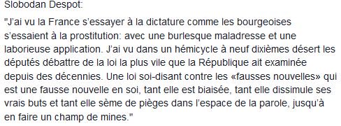 On en est peut-être plus à «vérité en deçà des Pyrénées, erreur au-delà»,mais au moins à «vérité d’un côté de la Méditerranée,erreur de l’autre» ou «vérité en deçà de la frontière russo-polonaise, erreur au-delà» ce qui, en quelques siècles, ne nous a pas fait fort avancer vers l’universel. La seule façon de résoudre nos différents avec le reste du monde, c’est la discussion libre. Comme la loi contre les fausses nouvelles a, semble-t-il, pour but principal de contrer ce que le gouvernement considère comme de la propagande pro-russe, il y a fort à craindre qu’elle ne fasse que renforcer la frontière mentale «russo-polonaise».