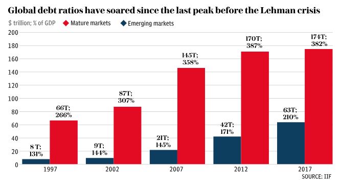 La planète n’a jamais été autant endettée. Elle est donc vulnérable à un étranglement monétaire. L’Institut de la finance internationale affirme que la dette mondiale a atteint 318 % du PIB à la fin de l’année 2017, soit 48 % de plus que le pic de la bulle qui a précédé la crise Lehman.