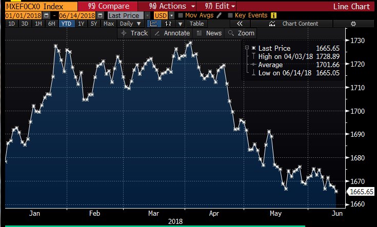 Les pays émergents affrontent des vents contraires en raison de la hausse des taux d’intérêt et du dollar américain ainsi que de la baisse du prix des matières premières. L’inflation était de 25,5 % en Argentine en avril 2018 et le FMI a été amené à prêter 50 milliards de dollars à l’Argentine pour éviter un défaut de paiement. La Turquie, avec 22 % de sa dette libellée en devises étrangères, est trop dépendante des capitaux externes ; son taux d’inflation est de 40 % et la livre turque a lourdement chuté. Au Brésil, la dette publique a atteint 87 % du PIB alors qu’elle n’était que de 62 % en 2014.
