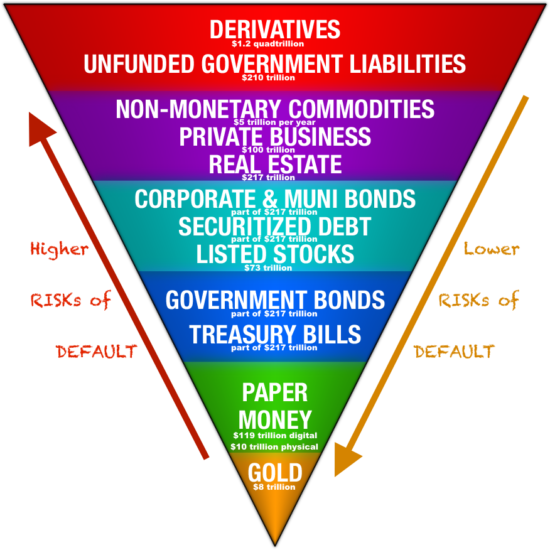 Le drame de notre temps, c’est la fameuse pyramide renversée de l’économiste américain John Exter reposant sur la pointe trop fragile du seul actif sûr, l’or, les autres actifs financiers étant beaucoup trop élevés et risqués, la palme revenant à la mauvaise herbe des produits bancaires dérivés.