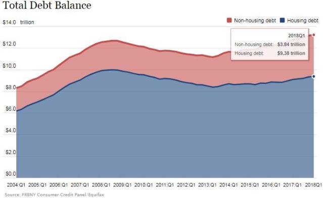 Selon les dernières données publiées par la Réserve Fédérale de New York, la dette des ménages américains vient d’atteindre un nouveau record absolu à 13220 milliards de dollars au 31 Mars 2018. C’est 540 milliards de plus que le record qui avait été enregistré au troisième trimestre 2008 à 12680 milliards $, au plus fort de la crise des subprimes. Cette dette, qui représente près de 6 fois le PIB de la France et près de 65% du Pib américain attendu en 2018, est majoritairement composée de crédits immobiliers, qui avaient été au cœur de la récession de 2008 aux États-Unis.