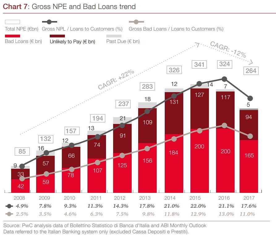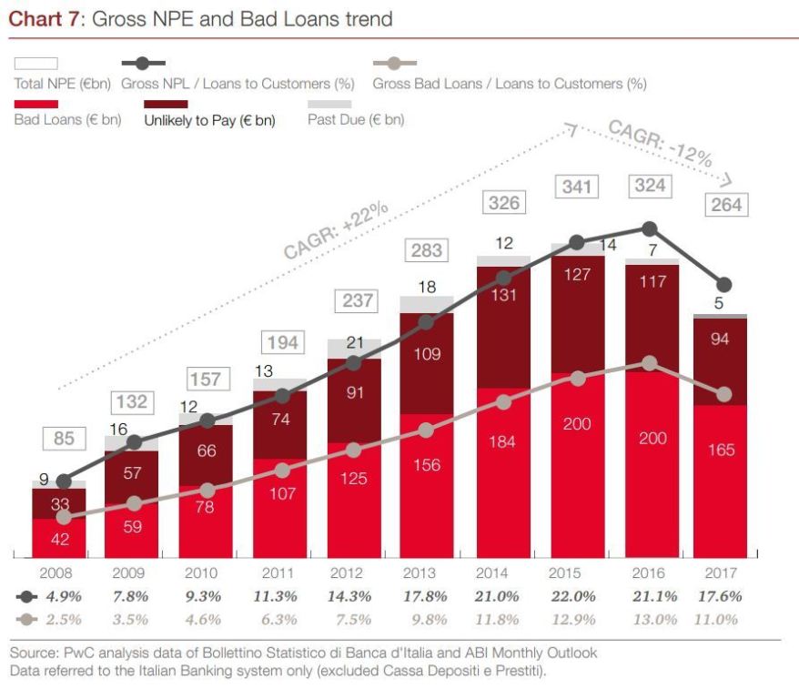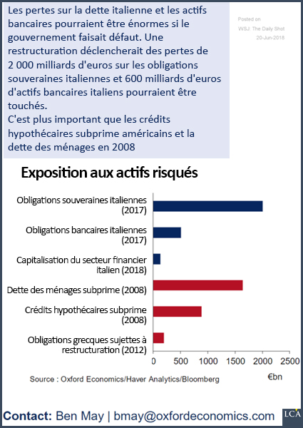 Nombre de banques locales et coopératives italiennes sont en grande difficulté et pourraient être liquidées tout comme les banques vénitiennes, il y a un an. L’an dernier, la banque Monte dei Paschi di Siena avait dû aussi être sauvée par l’État italien, aujourd’hui actionnaire majoritaire à 68 % ; le prix de l’action vient de baisser de 20 %. Le cours des deux plus grandes banques italiennes, UniCredit et Intesa, vient de perdre 10 % et 18 %. Le deuxième point de fragilité des banques italiennes, au-delà des créances douteuses, est leur exposition aux obligations de l’État, qui représentent 20 % de leurs actifs, soit l’un des ratios les plus exposés du monde.