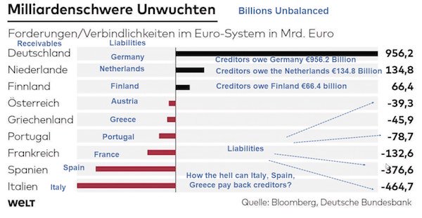 Enfin, l’Italie et l’Espagne plongent de plus en plus avec des déficits de mouvements de capitaux en zone euro (balances Target 2) de l’ordre de 400 milliards d’euros pour chacune, tandis que l’Allemagne accumule les excédents (900 milliards d’euros).